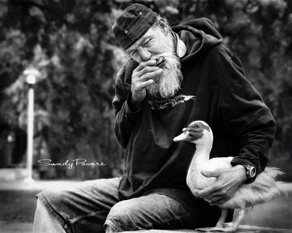 One more time. In the middle of a conversation, he recognized "his duck", Daffy. He had been missing her. When he called her, she waddled up to him, jumped on his lap, and he played for her. I could tell Lite was sick, and a friend soon contacted me and said he had died. Lite had asked his friend to find me and tell me I was the kindest person he'd ever known. A true gentleman and friend!