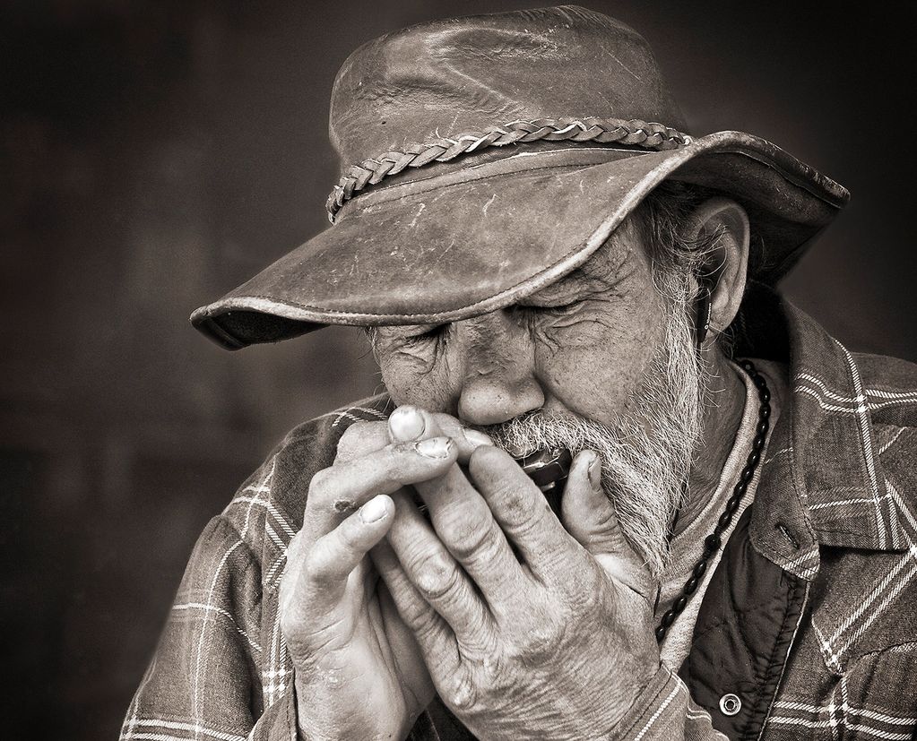 Lite again. I saw him next at the park where I often ate lunch. Again playing his harmonica. I told him his previous photo had won two photography awards. At the time, I was shooting for a contest in which his face would be perfect for. He was game, and again his photo was awarded, and later, it was curated into a temporary "Blue" Exhibit at the A. Smith Gallery of Art. He was thrilled.