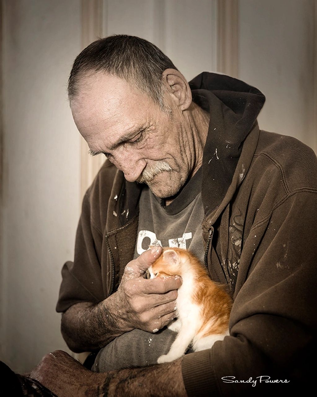 Wayne. I met Wayne through Lite. They were friends. His wife was Barbara. The two of them actually escaped homelessness and had a little place in downtown San Antonio. They always welcomed folks who needed a shower or something to eat. Barbara loved cats. Wayne swore he did NOT! But I caught this moment during one of my many visits, and beg to differ with him, haha!
